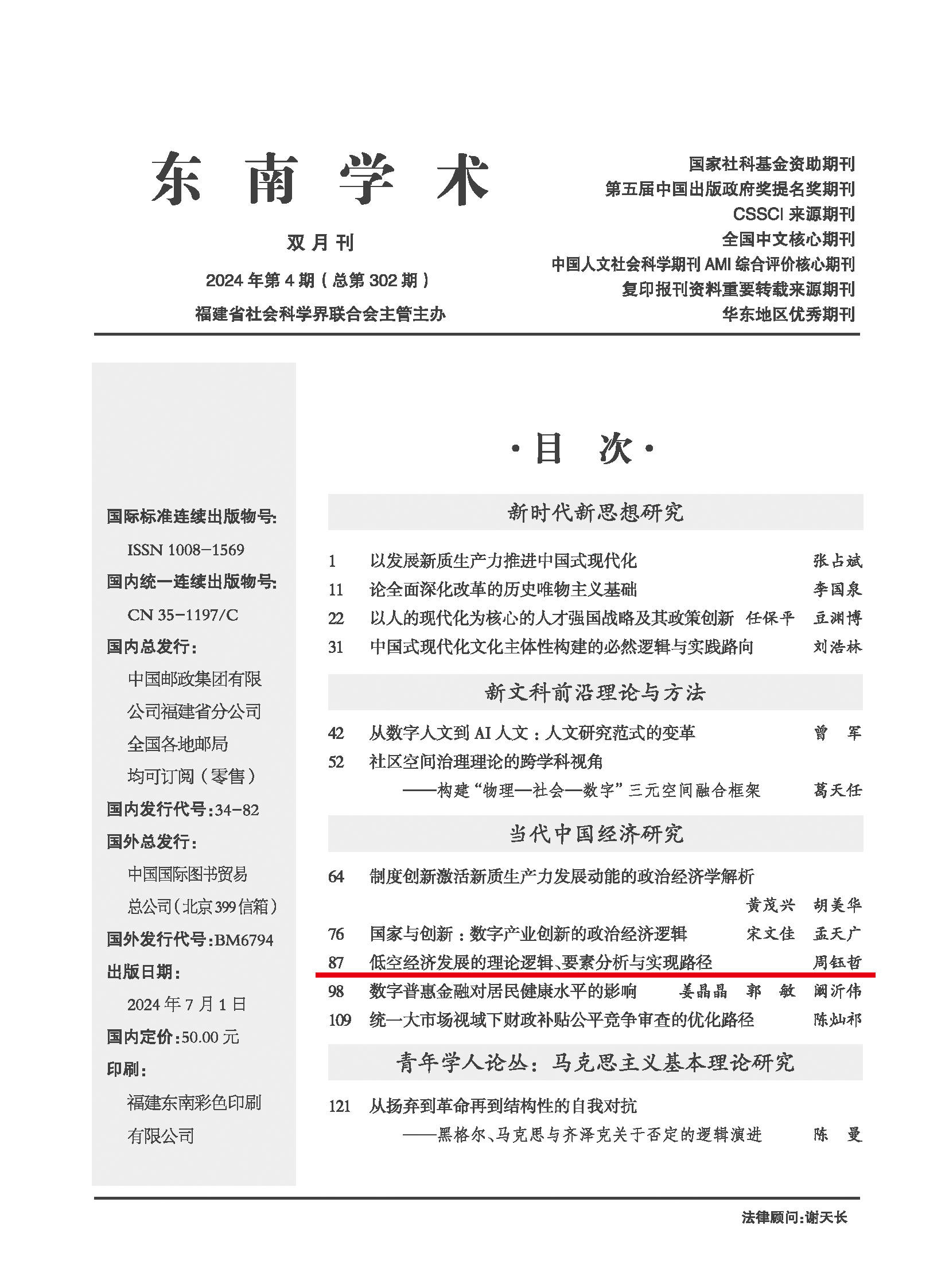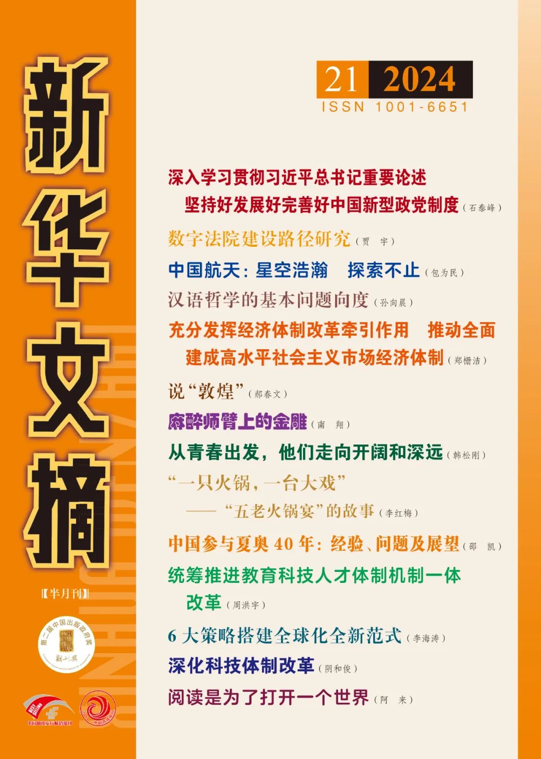 截至目前,2024年《东南学术》已被《新华文摘》《中国社会科学文摘》《高等学校文科学术文摘》《人大报刊复印资料》等全国性重要文摘以不同形式转载转摘56篇次。其中,《新华文摘》纸质版全文转载4篇(含上封面要目2篇),论点摘编3篇,篇目辑览4篇,网络版转载2篇;《中国社会科学文摘》全文转载2篇;《高等学校文科学术文摘》全文转载6篇;“人大复印资料”转载23篇。