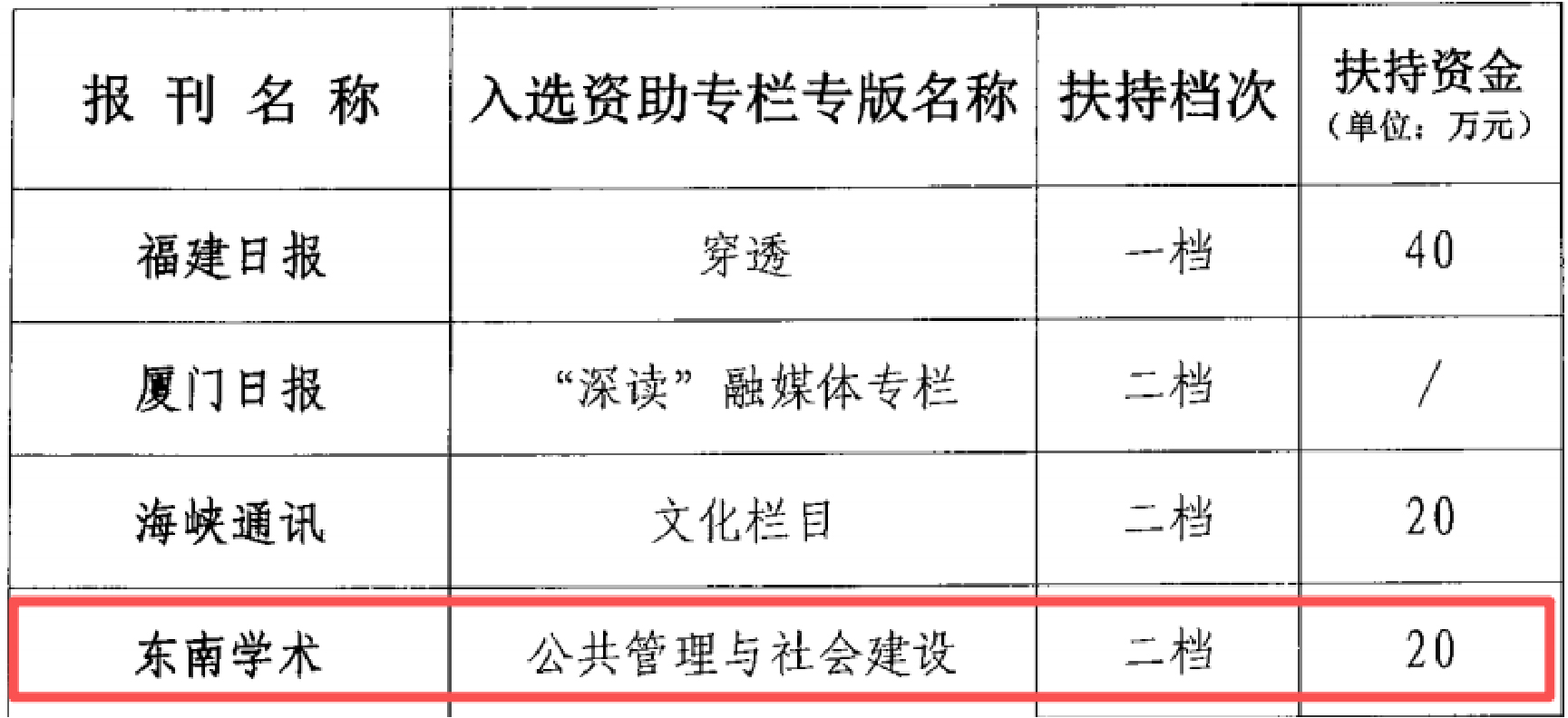 近日,《东南学术》开设的“公共管理与社会建设”栏目被福建省新闻出版局评为“2025年福建省报刊十大名栏目”,并获专项扶持资金。