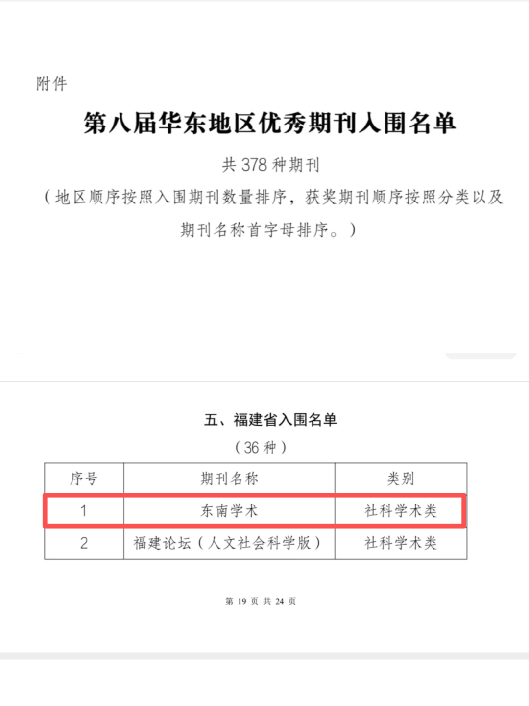 12月5日,华东地区优秀期刊评审委员会发布《关于第八届华东地区优秀期刊推荐结果的通报》,经各省(市)期刊协会初评推荐,华东地区优秀期刊评审委员会终评审议通过,《东南学术》入围第八届华东地区优秀期刊。